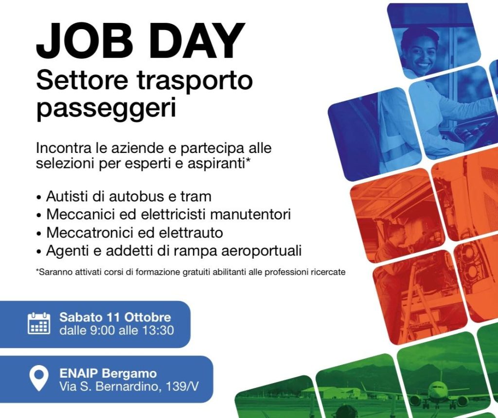 Questi gli ingredienti del Job Day Settore Trasporto Passeggeri che si terrà sabato 11 ottobre dalle ore 9:00 alle ore 13:30 nella sede di Fondazione ENAIP Bergamo, in via San Bernardino 139/V.